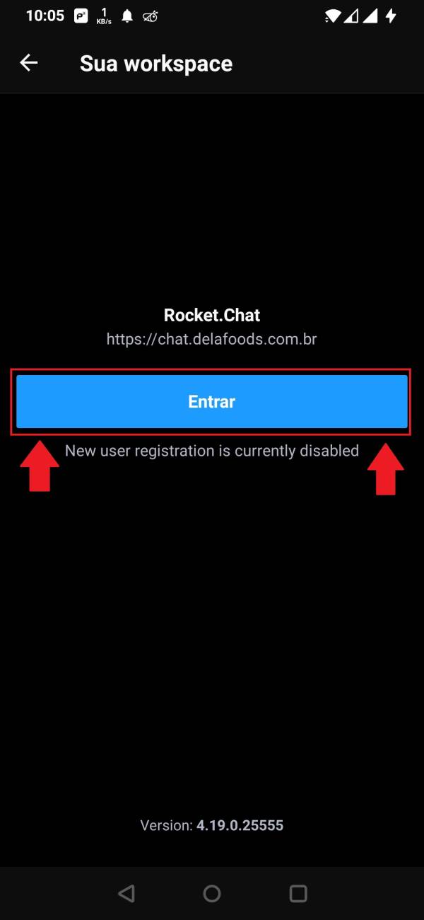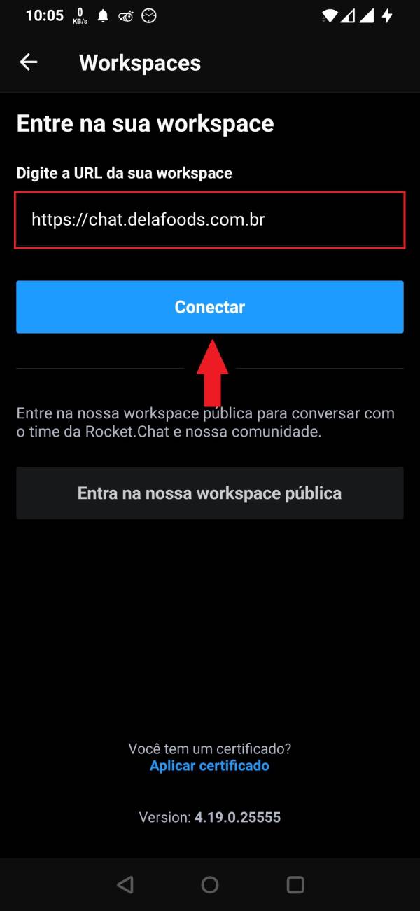 Na Primeira tela do Aplicativo, basta clicar em Entre numa workspace para inserir os dados do nosso servidor:
